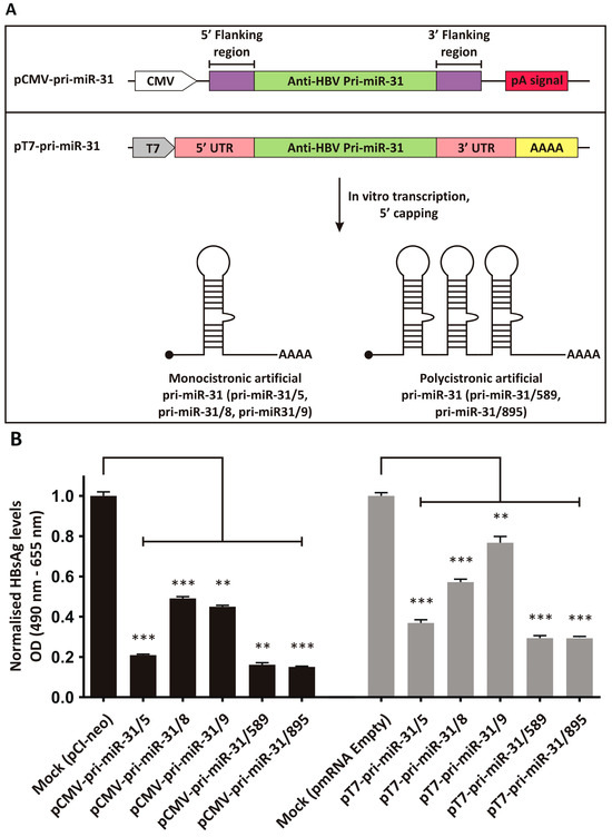 Design and inhibitory capacity of artificial pri-miR-31 expression vectors. (A) Upper panel: Original CMV promoter-driven anti-HBV artificial pri-miR-31 vector. Bottom panel: Vector design for in vitro transcription of artificial pri-miR-31 sequences. The vector contains the T7 promoter to enable use of the T7 bacteriophage RNA polymerase. The 3′ end comprises a sequence encoding a 52 nucleotide stretch of adenosines, which makes up the polyA tail. RNAs are capped in a separate enzymatic reaction to add a 7-methylguanosine to the 5′ end. (B) HBsAg secretion from HepG2-hNTCP co-transfected with the pri-miR-31 expression vectors (CMV promoter-driven vectors, left and IVT vectors, right) and the HBV target plasmid, pCH-9/3091, were determined by ELISA. The graphs were plotted as the mean ± the standard error of the mean (SEM) (n = 3). The statistical significance was calculated using the Student’s paired two-tailed t-test (*** indicates p < 0.001 and ** indicates p < 0.01).