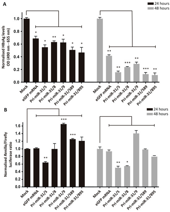 The silencing efficiency was assessed by transfecting HepG2-hNTCP cells sequentially with pCH-9/3091 and then in vitro transcribed artificial pri-miR-31 RNA sequences. The transfection efficiencies were confirmed by microscopy (mCherry for plasmid transfection and GFP for RNA transfection) and the amount of HBsAg secreted was measured in the culture supernatants. Treatment of cells receiving the HBV target plasmid, pCH-9/3091, with the in vitro transcribed artificial pri-miR-31 sequences resulted in significant reductions in secreted HBsAg from HepG2-hNTCP cells (Figure 2A, Pri-miR-31/5 p = 0.0128; Pri-miR-31/8 p = 0.0084; Pri-miR-31/9 p = 0.0219; Pri-miR-31/589 p = 0.0113; Pri-miR-31/895 p = 0.0289 at 24-h and Pri-miR-31/5 p = 0.0012; Pri-miR-31/8 p = 0.0004; Pri-miR-31/9 p = 0.0027; Pri-miR-31/589 p = 0.0001; Pri-miR-31/895 p = 0.0014 at 48-h; d.f. = 4). Furthermore, the effect was enhanced 48 h post-transfection (12.7–30.3%) as compared to 24 h post-transfection (5.6–22.1%). However, the control in vitro transcribed eGFP mRNA also caused significant reduction in secreted HBsAg (Figure 2A, eGFP mRNA p = 0.0172 at 24-h and p = 0.0017 at 48-h; d.f. = 4). These findings indicate that the observed reduction in HBsAg levels is a result of non-specific inhibition, rather than sequence-specific silencing by the RNAi pathway. The reductions in HBsAg levels by the artificial pri-miR-31 sequences were greater than the reduction caused by the eGFP mRNA, suggesting that there is some sequence-specific silencing. When a commercially available GFP mRNA, produced with modified nucleotides and purified by HPLC (CleanCap® EGFP mRNA, TriLink Biotechnologies, San Diego, CA, USA), was used there was minimal reduction in HBsAg levels (Supplementary Figure S2). This result suggests that the in vitro transcribed artificial pri-miR-31 sequences can be further optimised to limit non-specific effects.