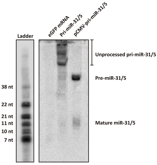 To determine whether in vitro transcribed artificial pri-miRNAs are processed into the expected mature miRNA guide sequences, the pri-miR-31/5 sequence was transfected into HEK293T cells, and the total RNA was assessed by Northern blot hybridisation analysis. HEK293T cells were transfected with 10 µg of in vitro transcribed eGFP mRNA, in vitro transcribed pri-miR-31/5 or pCMV-pri-miR-31/5. The RNA transfections were carried out using Lipofectamine™ MessengerMAX™ Transfection Reagent whereas the DNA transfection was performed using the Lipofectamine™ 3000 Transfection Reagent. The eGFP or pri-miR-31/5 transfected cells were analysed by fluorescence microscopy one day after transfection and the total RNA was isolated using TRIzol™ Reagent. The pCMV-pri-miR-31/5 transfected cells were analysed two days after transfection followed by total RNA extraction. For Northern blot hybridisation analysis, a radioactively labelled molecular weight ladder and probe were generated. To generate the molecular weight ladder, several oligonucleotides (7 nt, 10 nt, 11 nt, 21 nt, 22 nt, 38 nt) were radioactively labelled separately and purified in a single Sephadex column. To generate the radioactively labelled probe for the detection of the miR-31/5 guide sequence, a complementary oligonucleotide was labelled and purified. The molecular weight ladder and 40 µg of total RNA were heat denatured and separated on a 20% denaturing polyacrylamide gel (8 M urea, 10× TBE) at 300 V. The gel was stained with ethidium bromide and imaged using a gel documentation system. Thereafter, the separated samples were electroblotted onto a nylon membrane and fixed to the membrane by UV crosslinking (Ultraviolet Crosslinker system, UVP, Upland, CA, USA). The region containing the ladder was cut from the rest of the membrane and exposed to a phosphorimager plate, which was imaged one day later (FLA-7000 imaging system, Fujifilm, Tokyo, Japan). The membrane containing the RNA samples was pre-hybridised with the PerfectHyb Plus buffer (Sigma-Aldrich, St. Louis, MO, USA) at 45 °C for 5 min with rotation. Hybridisation with the radioactively labelled probe was carried out overnight at 45 °C. Following overnight hybridisation, the membrane was subjected to two low stringency washes (2× SSC, 0.1% SDS at 25 °C for 5 min) and two high stringency washes (0.5× SSC, 0.1% SDS at 42 °C for 20 min). The membrane was exposed to a phosphorimager plate and imaged one week later using the FLA-7000 imaging system.