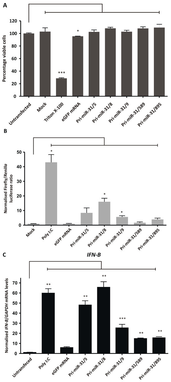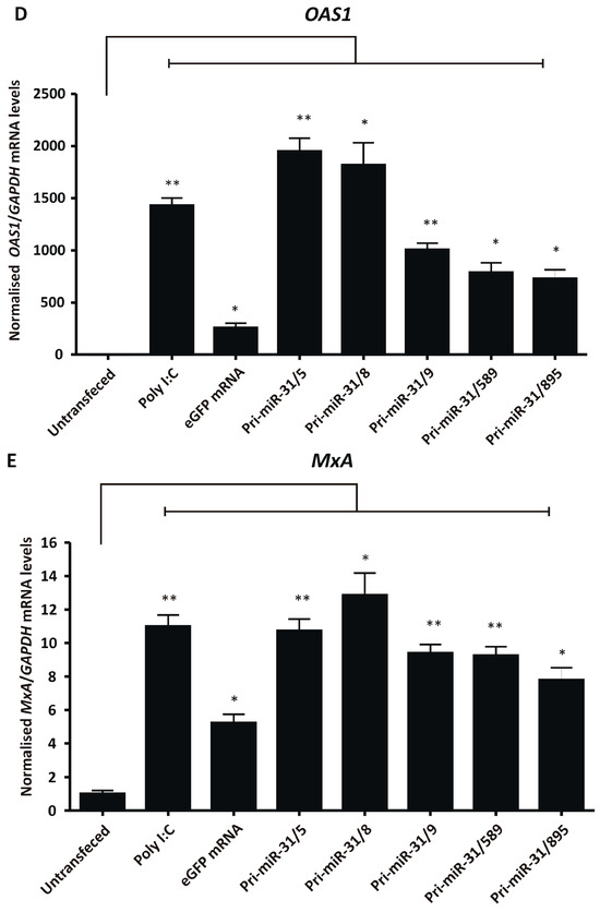 To further characterise interferon response stimulation by the in vitro transcribed artificial pri-miR-31 sequences, sensitive RT-qPCR was carried out to measure changes in IFN-β, OAS1 and MxA gene expression. HEK293T cells were transfected with in vitro transcribed 5′ capped eGFP mRNA and artificial pri-miR-31 sequences. Using the more sensitive RT-qPCR assays revealed significant increases in IFN-β (Pri-miR-31/5 p = 0.0096; Pri-miR-31/8 p = 0.0075; Pri-miR-31/9 p = 0.0174; Pri-miR-31/589 p = 0.0033; Pri-miR-31/895 p = 0.0054; d.f. = 4), OAS1 (Pri-miR-31/5 p = 0.0041; Pri-miR-31/8 p = 0.0138; Pri-miR-31/9 p = 0.0041; Pri-miR-31/589 p = 0.0140; Pri-miR-31/895 p = 0.0136; d.f. = 4) and MxA (Pri-miR-31/5 p = 0.0072; Pri-miR-31/8 p = 0.0138; Pri-miR-31/9 p = 0.0025; Pri-miR-31/589 p = 0.0051; Pri-miR-31/895 p = 0.0160; d.f. = 4) gene expression in cells treated with artificial pri-miR-31 sequences (Figure 4C–E). In the case of pri-miR-31/5 and pri-miR-31/8, the degree of stimulation was comparable to that of the positive inducer of the interferon response, poly I:C. Cells transfected with in vitro transcribed eGFP mRNA also exhibited increased expression of OAS1 and MxA. A commercial GFP reporter mRNA (CleanCap® EGFP mRNA, TriLink Biotechnologies, San Diego, CA, USA) did not increase expression of any of the tested interferon response genes (Supplementary Figure S4). Collectively, these results demonstrate that the in vitro transcribed artificial pri-miR-31 sequences stimulate the interferon response, which is a likely explanation for the non-specific silencing of HBV gene expression observed (Figure 2A,B).