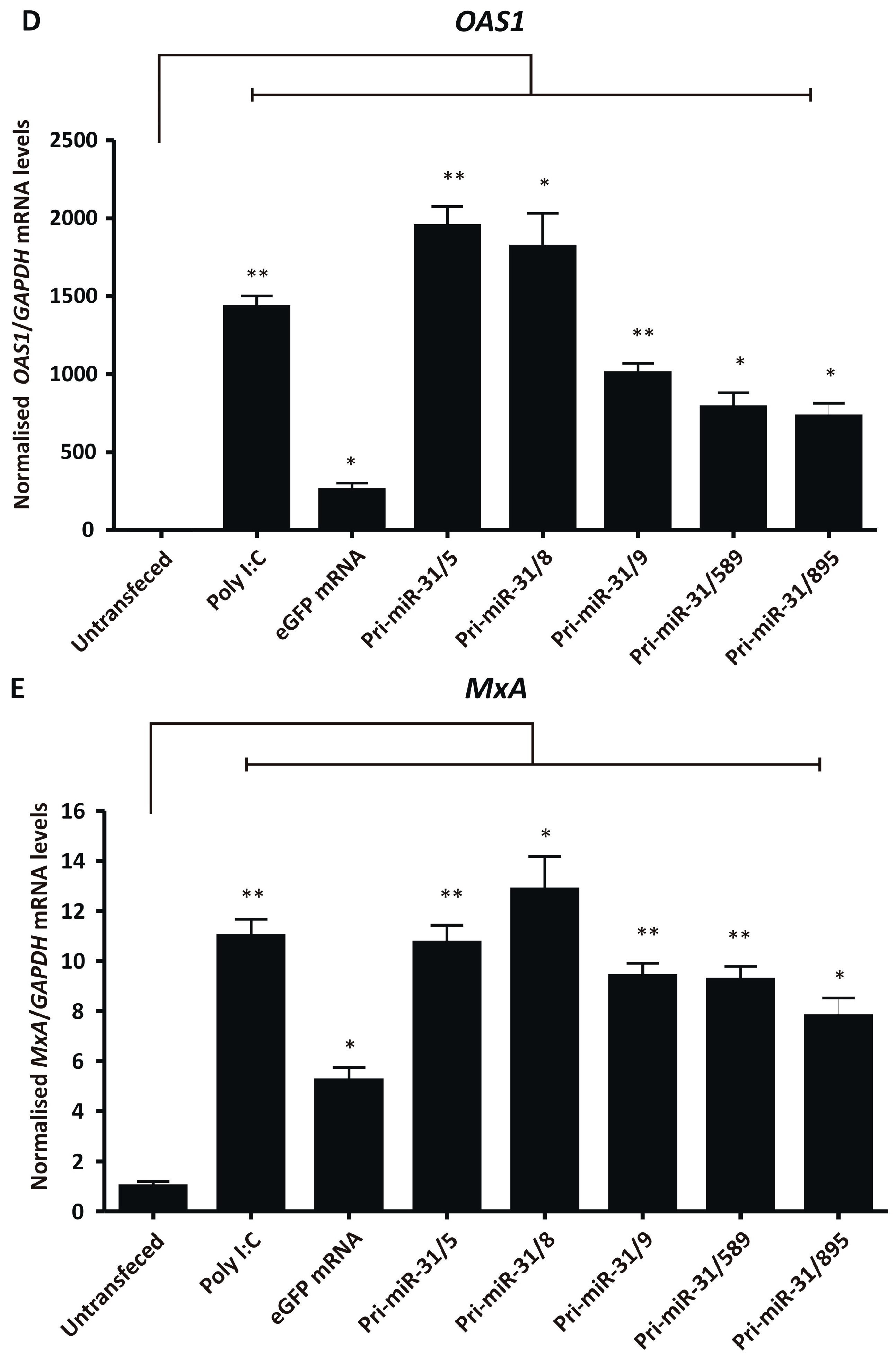 Stimulation of the interferon response in HEK293T cells transfected with in vitro transcribed artificial pri-miR-31 sequences was assessed by dual-luciferase assay and RT-qPCR. HEK293T cells were seeded in 24- or 48-well plates at a confluency of 45% and transfected one day later. For RT-qPCR analysis HEK293T cells in 24-well plates were transfected with 500 ng of poly I:C, in vitro transcribed eGFP mRNA or in vitro transcribed pri-miR-31 sequences. The transfections were carried out in triplicate using the Lipofectamine™ MessengerMAX™ Transfection Reagent. Twenty-four hours post-transfection the culture supernatant was discarded and total RNA extracted from the cells using Trizol® Reagent (Invitrogen™, Thermo Fisher Scientific, Waltham, MA, USA). IFN-β, OAS1, MxA and GAPDH gene expression was measured using the Luna® Universal One-Step RT-qPCR Kit (New England Biolabs, Ipswich, MA, USA) with the CFX96 Touch™ Real-Time PCR Detection System (Bio-Rad, Hercules, CA, USA). Primers used for RT-qPCR have been described before [42], with the following cycling conditions: reverse transcription at 55 °C for 10 min, initial denaturation at 95 °C for 1 min, 44 cycles of denaturation at 95 °C for 10 s, extension at 60 °C for 30 s. Melting curve analysis was carried by measuring amplicons denaturation across 65 °C to 95 °C, at increments of 0.5 °C for 5 s (plate read at each temperature increment).