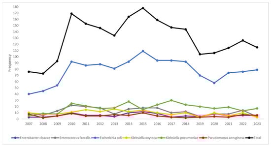 3.2. Temporal Trends in Antibiotic Resistance by Pathogen