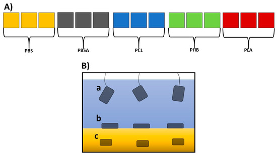 The bottom of each tank was covered with natural gravel (coralline sand, grain size 0.4–0.8, Arena Silex, Manufacturas Gre, S.A., Biscay, Spain), and each tank was filled with 50 L of filtered seawater (filtered with VakuumFiltration from TPP Techno Plastic Products AG with PES membrane, 0.22 µm pore size) collected from the Gulf of Naples. The water was continuously pumped (Micra 400 L/h, SICCE, Pozzoleone, VI, Italy) into a filtration compartment containing porous ceramic rings, a 20 PPI non-biodegradable synthetic sponge (Aquarialand, Torino, Italy), and perlon wool [17,35]. To avoid any salinity variation, the evaporation was balanced with periodic additions of distilled water. This system assured a constant temperature of 18 °C, a salinity of 37–38 PSU, a pH close to 8.2, and low concentrations of the main nutrients (NH4, NO2, NO3, and PO4) (see Tables S1 and S2). After each addition, the salinity was checked by a refractometer (Sper Scientific, Scottsdale, Arizona). Polymers were produced according to the procedures indicated by Viel et al. [15]. Rectangular sheets of the five BPs (PLA, PCL, PHB, PBSA, and PBS) sized 15 cm × 5 cm with a thickness of 1 mm were introduced in each tank in specific filter bags for aquaria in triplicate for each of the three conditions indicated in Figure 1B.