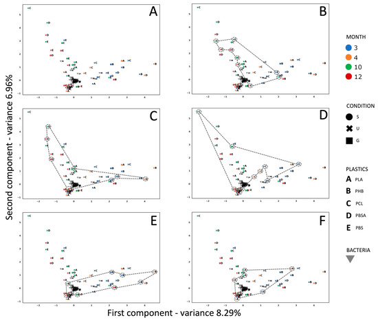 (A) MCA analysis showing the correlation between experimental conditions, i.e., different observations related to the polymers in the mesocosm, different positions of the polymers in the mesocosm (S = suspended; U = under gravel; G = gravel), and different months in which the bacterial strains were isolated (3 = October 2021, 4 = November 2021, 10 = May 2022, 12 = July 2022). (B) PBS observations are highlighted; (C) PBSA observations are highlighted; (D) PCL observations are highlighted; (E) PHB observations are highlighted; (F) PLA observations are highlighted.