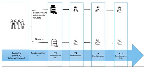 This is a multicentric, randomized, double-blind, placebo-controlled, parallel-arm trial aimed at evaluating the efficacy of Bifidobacterium adolescentis PRL2019 in pediatric patients (>four years) with IBS of any subtype within the Rome IV criteria [1].