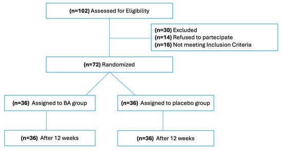 After the screening phase, eligible patients were randomly assigned to either one oral stick containing 20 × 109 colony-forming units of Bifidobacterium adolescentis PRL2019 (Gabapral, Pontenure, Italy) or an equivalent placebo, once a day, in a 1:1 ratio, for 12 weeks. Study visits were conducted every four weeks during the treatment period. All the subjects were blindly allocated using scratch cards to one of the two treatment groups according to a computer-generated randomization list provided by our statistician. An independent statistician used a validated program to generate a randomization list with blocks, block size = 4, pre-allocated to centers. Patients and study investigators were blinded to the randomization codes. The codes were kept confidential until the end of the study when the randomization code was broken after the database lock.