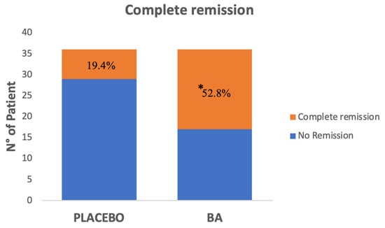 Complete remission in Bifidobacterium adolescent’s PRL2019 (BA) and placebo group * significant difference vs. T0.