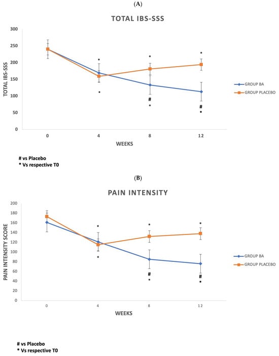 In our study, 52.8% of IBS patients receiving BA achieved total remission of symptoms, compared with 19.4% in the placebo group (p < 0.05). We found that all considered IBS scores (IBS-SSS, PIS, LIS, PFS) significantly improved both in the BA and placebo group by the end of the treatment. Four weeks of treatment were sufficient to observe a significant reduction in all symptom scores in both groups. However, upon intergroup comparison, only the BA group showed a significant reduction in IBS-SSS, PIS, and PFS at T8 and T12 of LIS at T12 when compared with placebo outcomes. In contrast, no significant differences were observed between the two groups at T4 upon intergroup analysis. These data can be explained by considering the well-known placebo effect described in IBS.