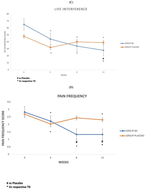 (A) IBS-Symptom Severity Scale (IBS-SSS) trend in BA and placebo group, (B) Pain Intensity Score (PIS) trend in BA and placebo group, (C) Life Interference Score (LIS) trend in BA and placebo group, (D) Pain Frequency Score (PFS) trend in BA and placebo group.