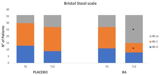 Bristol Stool Chart (BSC) subtypes in BA and in placebo groups at baseline and after 12 weeks. * Significant difference vs. T0.