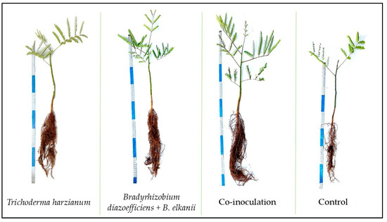 Presumably, among the multiple benefits associated with microbial consortia, one of the indirect mechanisms possibly correlated with the effects on promoting the growth of tree legumes is biotic stress conditions, which are correlated with the protection apparatus. The effects attributed to synergistic microorganisms include the dynamism surrounding antibiosis, competition, or parasitism of phytopathogenic agents, qualified for delineating a rhizospheric environment favorable to root growth and stress-free conditions [34,35].