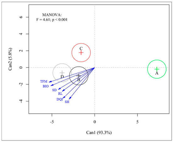 Multivariate statistical analysis (analysis of canonical variables) showed a relationship between growth parameters and seedlings of Schizolobium parahyba var. parahyba treated with suspension of microorganisms and co-inoculation. A: control; B: co-inoculation; C: Bradyrhizobium diazoefficiens (SEMIA 5080) + B. elkanii (SEMIA 587); D: Trichoderma harzianum ESALQ 1306. Shoot height (SH), stem diameter (SD), root length (RL), total fresh biomass (TFM), dry biomass (BIO), and Dickson quality index (DQI).