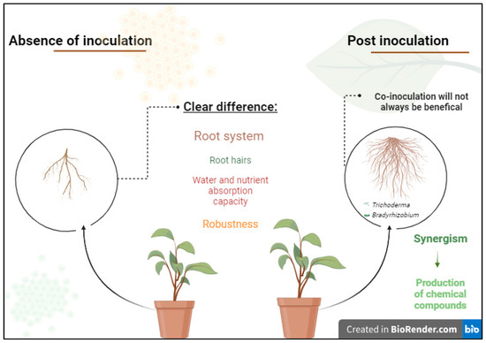 Plant co-inoculation can have three aspects, beneficial, antagonistic, or null, through the high variability during the microbial association mechanism [21]. According to the broad effects on biostimulation of plant growth, recently, the growing global supply of bio-inputs has become increasingly stronger with applications to different species of beneficial microorganisms responsible for consistent, fast, satisfactory results, which are alternatives to the excessive use of fertilizers [22,23].