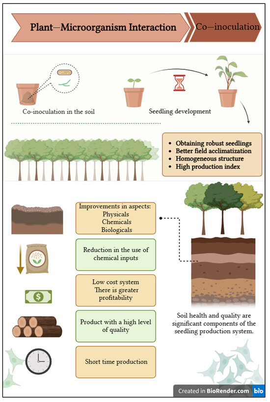 The large deficit of scientific research on native forest species compromises considerable advances in production systems, with co-inoculation being an area of innovation for large-scale and short-term production, with an impact on the forestry market and reforestation projects; it is suitable for adverse environments, competitive in terms of space (weeds and others), and successful in the search for vital resources (light, water, and nutrients) and adapting to climate fluctuations.
