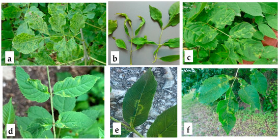 Symptoms observed in collected Fraxinus spp. leaf samples. a: Leaf deformation and mottling in F. ornus (Hamburg, Germany); b: shoestring symptoms in F. excelsior, characterized by elongated and narrowed leaves (Melzower forest, Germany); c: chlorotic line pattern and leaf deformation in F. excelsior (Sigtuna, Sweden); d: leaf deformation and line pattern in F. excelsior (Oberbozen, Italy); e: chlorotic line pattern on F. excelsior leaves (Basel, Switzerland); f: chlorosis and leaf deformation in F. excelsior (Bromma, Sweden). The presence of ASaV has been confirmed by RT-PCR.