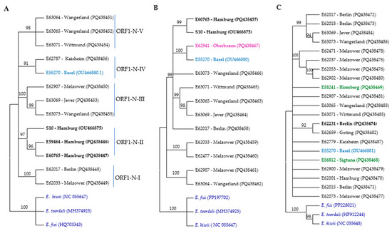 The two regions of the ASaV RNA1 genome, the ORF1 N-proximal region and ORF1 C-proximal region, are located at positions 840–1875 and 4361–5474 (numbers based on antigenome reference isolate acc. no. OU466880), respectively. The pairwise comparisons of 11 samples including E59464, E60765, E62017, E62033, E62787, E62907, E63064, E63065, E63069, E63071, and E63073 for ORF1 N-proximal and E60765, E62017, E62033, E62907, E63064, E63065, E63069, E63071, E63073, E62477, and E62941 for ORF1 C-proximal, along with two isolates from GenBank (accession numbers OU466880 and OU466875), showed nucleotide-level identities of 92.88–100% and 87.62–99.91%, respectively, in the sequenced isolates. In the ORF1 N-proximal region, the highest identity (100%) was recorded between E62907 (Melzower forest in eastern Germany) and isolates E63069 and E63073 (from Jever and Wangerland in the west of Germany). The lowest identity (92.88%) was observed between E62033, sampled from Melzower forest in northeast Germany, and E55270, sampled from Basel, Switzerland. In the ORF1 C-proximal region, the lowest identity (87.62%) was observed between isolate S10 (Hamburg, Germany) and E63064 (Wangerland, Germany). The highest identity (99.91%) was observed between two isolates from Melzower, forest E62477 and E62033. Interestingly, these isolates shared only 89% identity with another isolate from the same location, E62907, indicating genetic variability among the group of isolates collected from the same location (Melzower forest, Germany).
