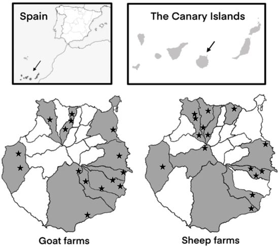 The study was conducted on 15 sheep farms and 15 goat farms located in ten and nine municipalities of Gran Canaria (Canary Islands, Spain), respectively (Figure 1). Farms were selected based on variations in their size, production systems, management practices, and hygienic–sanitary measures. From each sheep farm, 5–8 faecal samples were collected from lambs aged 1–2 weeks and from 5–8 recently lambed ewes. Similarly, from goat farms, 8 samples were collected from goat kids within the same age range as the lambs, as well as 8 samples from recently lambed goats. The WinEpiscope software 2.0 (http://www.winepi.net/ (accessed on 13 December 2023)) was used to determine the number of animals sampled per farm.