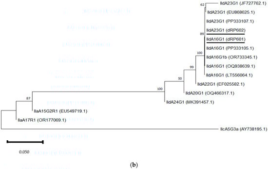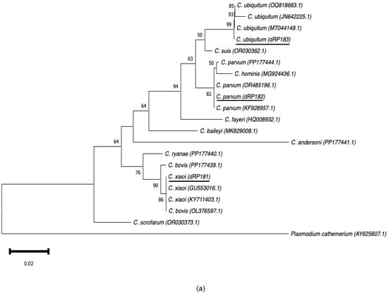 Neighbour-joining trees were constructed using aligned SSU rRNA and GP60 sequences obtained in this study, along with sequences downloaded from the GenBank database (Figure 3a,b). The SSU rRNA neighbour-joining tree showed that the sequences obtained clustered with those of the same Cryptosporidium species selected from GenBank. In the GP60 neighbour-joining tree, three distinct groups were identified, corresponding to families IId, IIa, and IIc. The sequences IIdA16G1 (dRP601) and IIdA23G1 (dRP602) clustered together with other sequences of the same subtype from GenBank.