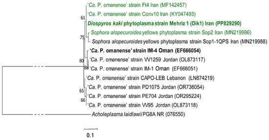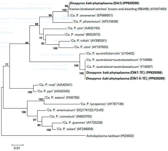 - Abu Alloush, A.H.; Tedeschi, R.; Alma, A.; Quaglino, F. Identification of phytoplasmas in stone fruit (Prunus sp.) and persimmon (Diospyros kaki L.) trees exhibiting leaf alterations and witches’ broom in Jordan. J. Phytopath. 2024, 172, e13302. [Google Scholar] [CrossRef]