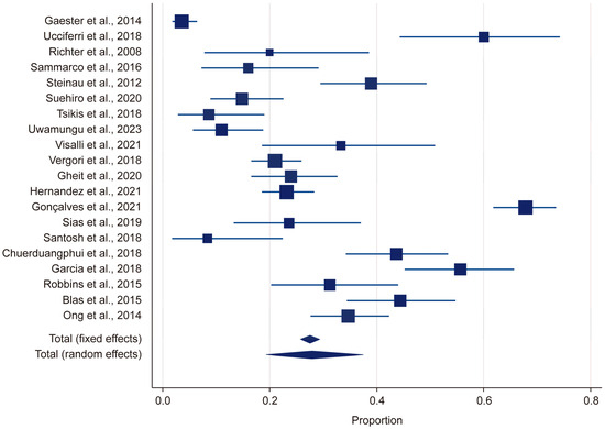 In this meta-analysis, the overall prevalence of LR-HPV genotypes in HIV-positive individuals was estimated to be 26.65%, with a 95% confidence interval (CI) ranging from 17.43% to 37.04%, indicating considerable variability across the studies (Table 3). The highest LR-HPV prevalence was reported by Gonçalves et al. (67.84%; 95% CI: 61.73–73.53), followed by Garcia et al. (55.67%; 95% CI: 45.23–65.76) and Chuerduangphui et al. (43.64%; 95% CI: 34.20–53.42) [18,30,31]. In contrast, the lowest prevalence rates were observed in Gaester et al. (3.53%; 95% CI: 1.71–6.40), Santosh et al. (8.33%; 95% CI: 1.75–22.47), and Tsikis et al. (8.62%; 95% CI: 2.86–18.98) [13,22,29]. This substantial variation in the prevalence rates suggested that there was high heterogeneity among the studies, likely due to differences in the HPV detection methods used, regional and demographic variations, and differences in the immunosuppression status among HIV-positive individuals.