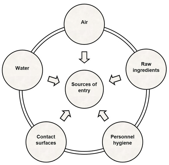 Microorganisms can enter food manufacturing facilities and industrial environments via airflow, water, personnel, or raw materials (Figure 1) [32]. Open and closed-flow systems make up a food processing plant. The open systems of the food processing plants comprise cutting boards, knives, slicers, and conveyor belts. The food utilized in such systems may be solid or liquid and is exposed to air. The system creates favorable conditions for bacterial adhesion and growth. Closed-flow systems are those used for carrying liquid and solid materials, such as pipelines, vessels, reactors, and closed containers. The system creates a solid–liquid interface for bacterial colonization and is incapable of being cleaned effectively, posing a risk of cross-contamination. Biofilms pose a strong concern in closed-flow systems. Open systems, on the other hand, represent solid–air and solid–liquid–air interfaces, facilitating bacterial desiccation in a low-aw food processing environment [33]. Solid–air interfaces represent the direct deposition of microorganisms from the contaminated food to the contact surfaces—whereas solid–liquid–air interfaces are created upon intermittent exposure of the contaminated low-aw foods to water during wet cleaning and sanitation, thus promoting microbial attachment to the food-contact surfaces [33]. Microorganisms adhering to food-contact surfaces can survive in the starvation phase without the presence of nutrients. This can raise their pathogenicity and subsequently increase their resistance to additional stresses [13,34]. Since production settings have a significant role in cross-contamination, it is essential to follow hygienic zoning within the facilities, as the zones are determined by possible risk sites (Figure 2) [32]. It aids in the identification of niches and harborage areas where prevalent pathogens are found.