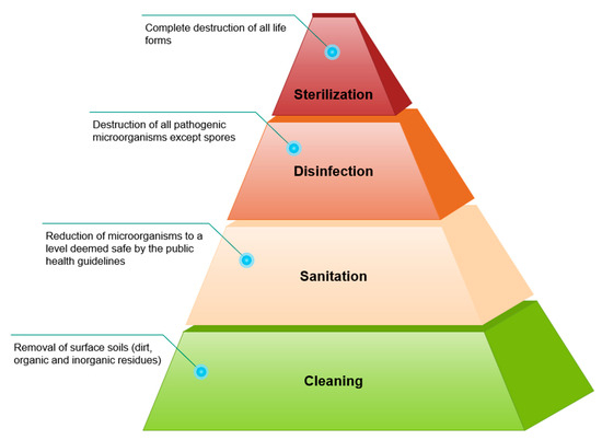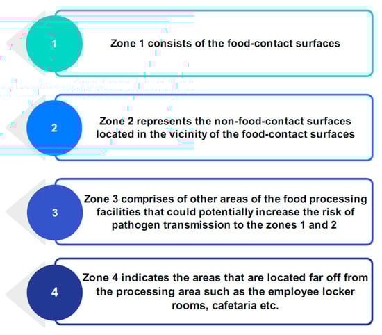 Cleaning, sanitation, disinfection, and sterilization are some of the different approaches that can be taken to lower the level of microbial contamination (Figure 3). Cleaning refers to the removal of surface soils and involves scrubbing, washing, and rinsing food-contact surfaces to get rid of visible contaminants like dust or food particles [36]. Food residues tend to accumulate in cracks, crevices, and irregular contact surfaces; however, they can be easily removed from smooth and nonporous surfaces. Food residue deposits left on food processing equipment after use are often contaminated with microorganisms that thrive off the soil’s nutrients. Usually, soap or another detergent and water are used to remove the soil deposits from the contact surfaces. After cleaning, sanitation and/or disinfection is performed to remove the microorganisms from the contact surfaces [37]. Sanitation is the reduction in microorganisms to a level deemed safe by public health guidelines. Disinfection results in the destruction of all pathogenic microorganisms except spores. Sterilization refers to the destruction of all life forms and is the most lethal of all the processes [38]. There is currently no known antimicrobial agent that is both broadly effective and capable of combining all the necessary properties required for efficient microbial eradication from food-contact surfaces [39]. Hygienic zoning, shown in Figure 2, classifies areas of a facility from most hazardous (Zone 1) to least hazardous (Zone 4) to enforce stricter hygiene standards in high-risk areas and lower them in others [39,40].