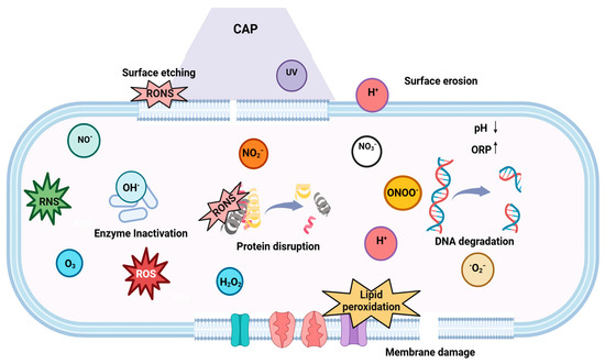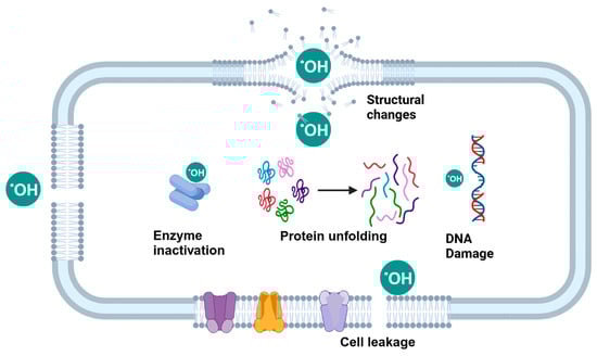 From the first action (Equation (1)), singlet oxygen species are generated, which react with the bilayer lipid and oxidize it [161]. As Reaction 1 is quick, the oxidizing reaction swiftly takes place, which leads to higher penetration by ozone. Xue et al. [162] showed that ozone exhibits a higher oxidizing potential (2.07 V) than other oxidizers such as hydrogen peroxide (1.78 V), chlorine gas (1.36 V), and oxygen (1.23 V). Other than the oxidization of the membrane and cell wall, which leads to cell wall leakage, O3 can disrupt the DNA structure by breaking the double-bond formation within the structure [162].
