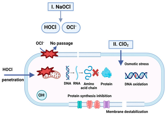 Disinfection mechanism of chlorine dioxide gas and sodium hypochlorite. Created with BioRender.com.