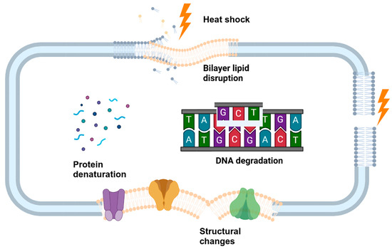High temperature denatures the cytoplasmic protein and induces membrane fluidization, resulting in cell death (Figure 8) [37]. Ban et al. [175] reported that SHS treatment of 200 °C for 10 s reduced the log counts to below the detection limit of 1.48 log CFU/cm2, of the Salmonella biofilms formed on the stainless steel. It has been well documented that bacterial exposure to sub-lethal temperatures induces a heat shock response and regulates the synthesis of various heat shock proteins (HSPs) [176,177]. These proteins help to rebind the proteins and sustain heat shocks. However, the high temperature of superheated steam can make the HSP non-functional by structural alterations, introducing a weak point in the cell’s defense mechanism [178]. Proteins may unfold or misfold because of heat shocks and other unfavorable development conditions, interfering with many cellular processes [178]. Eventually, the cells stop functioning, leading to cell lysis and cell death. A study by Ban et al. [179] evaluated the transcriptional response of Salmonella Typhimurium biofilms after SHS treatment at 200 °C for shorter intervals of 1, 3, 5, 10, and 20 s. The study observed an upregulation of the genes encoding several HSPs after 1 s of SHS treatment. Nevertheless, studies related to the transcriptional response of bacteria with superheated steam are limited and demand a detailed investigation.