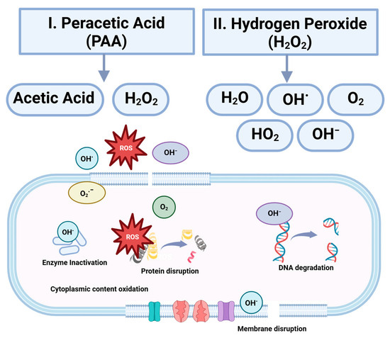 - Linley, E.; Denyer, S.P.; McDonnell, G.; Simons, C.; Maillard, J.Y. Use of Hydrogen Peroxide as a Biocide: New Consideration of Its Mechanisms of Biocidal Action. J. Antimicrob. Chemother. 2012, 67, 1589–1596. [Google Scholar] [CrossRef] [PubMed]