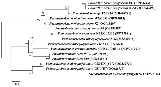 A halotolerant bacterial strain capable of efficiently degrading prometryne under saline conditions (30.0 g/L NaCl) was isolated from the sediment of a sea cucumber seeding pond and was designated PC. Colonies of the strain PC that grew on the solid culture medium were milky-white, circular, slightly convex, smooth on the surface, and opaque (the SI File, Figure S1A). The strain PC was identified as a Gram-positive bacterium based on the Gram staining test (the SI File, Figure S1B). The cells of the strain PC were rod-shaped, with the mean diameter of approximately 2.8–3.4 μm × 0.43–0.49 μm (the SI File, Figure S1C). The 16S rDNA sequence of the strain PC with the length of 1465 bp was obtained and deposited in the National Center for Biotechnology (NCBI) GenBank database (https://www.ncbi.nlm.nih.gov/genbank/, accessed on 3 July 2024) with the accession number of PP980446. A phylogenetic tree of the strain PC (Figure 1) was constructed, which showed that it shared 100.0% homology with Paenarthrobacter ureafaciens 05-507 (OP547495). Accordingly, the strain PC was identified as P. ureafaciens. The strain PC was preserved in the China General Microbiological Culture Collection Center (CGMCC) under the preservation number of CGMCC 1.64779.