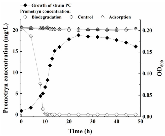 As demonstrated in Figure 2, the time curves of prometryne degradation, bacterial cell growth, and two control groups were determined. The degradation percentages of prometryne by growing cells of the strain PC at 4 h, 8 h, and 12 h were 10.1%, 64.6%, and 100.0%, respectively. Meanwhile, the strain PC entered the logarithmic phase at approximately 8 h and transitioned to the late logarithmic phase at around 14 h. In comparison, no significant decline in prometryne concentration was observed in either the uninoculated medium or that inoculated with inactivated bacterial cells during the entire 48 h period. It was hypothesized that the elimination of prometryne was predominantly attributable to biodegradation by the strain PC.