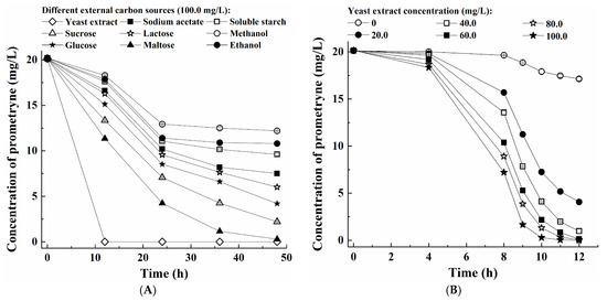 As shown in Figure 3A and Figure S2A, the strain PC exhibited a significantly diminished prometryne degradation efficiency and cell growth rate when using ethanol or methanol as the additional carbon source. Less than 50.0% of 20.00 mg/L prometryne was degraded within 48 h. In comparison, the addition of sucrose, glucose, lactose, soluble starch, sodium acetate, or maltose resulted in higher prometryne degradation percentages within 48 h (ranging from 52.4% to 98.6%) as well as faster cell growth rates of the strain PC. Furthermore, yeast extract was found to have the greatest promotive effect on both prometryne degradation and the growth of the strain PC. Growing cells of the strain PC were capable of completely degrading 20.00 mg/L prometryne within 12 h using 0.1 g/L yeast extract as the co-substrate. Consequently, yeast extract was selected as the optimal additional carbon source for further study. In addition, the strain was found to be capable of using single carbon sources (e.g., maltose, sucrose, glucose, etc.) for both prometryne degradation and cell growth, suggesting that the strain PC was able to utilize prometryne as the sole nitrogen source because prometryne was the only nitrogenous component in the medium. Subsequently, the effect of the yeast extract concentration on the strain PC was further investigated. As demonstrated in Figure 3B, the degradation efficiency of prometryne increased significantly with the presence of 0.02–0.1 g/L yeast extract in comparison to the absence of yeast extract. Meanwhile, the cell growth rate of the strain PC was also significantly enhanced by the incorporation of 0.02–0.1 g/L yeast extract (Figure S2B). To ensure the complete degradation of 20.00 mg/L prometryn within 12 h, the optimal concentration of additional yeast extract was determined to be 0.1 g/L.