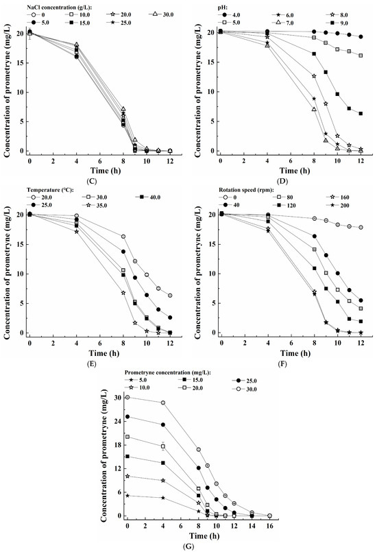 Optimization of the conditions for prometryne degradation by growing cells of the strain PC: (A) type of additional carbon source, (B) yeast extract concentration, (C) NaCl concentration, (D) pH, (E) temperature, (F) rotation speed, and (G) initial prometryne concentration.