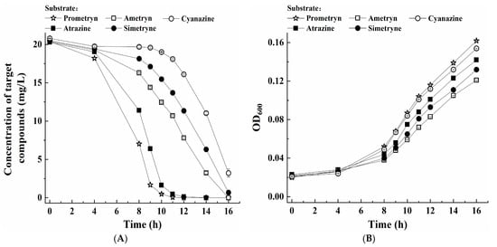 (A) Degradation of five different s-triazine herbicides by growing cells of the strain PC and (B) corresponding bacterial growth.