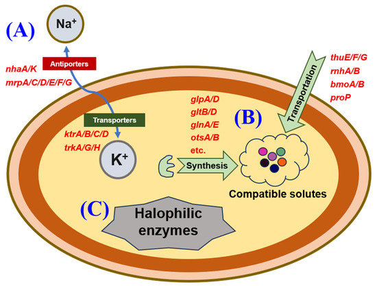 A schematic diagram of the possible halotolerance mechanisms of strain PC: (A) the “hypersaline-in” strategy, (B) the “organic-solutes-in” strategy, and (C) the production of halophilic enzymes.