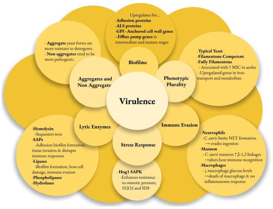 Candida auris virulence factors. ALS—agglutin-like sequence, GPI—glycosylphosphatidylinositol, MIC—minimum inhibitory concentration, NET—neutrophil extracellular traps, Hog—high osmolarity glycerol, SAPK—stress-activated protein kinase, SAP—secreted aspartyl proteases.