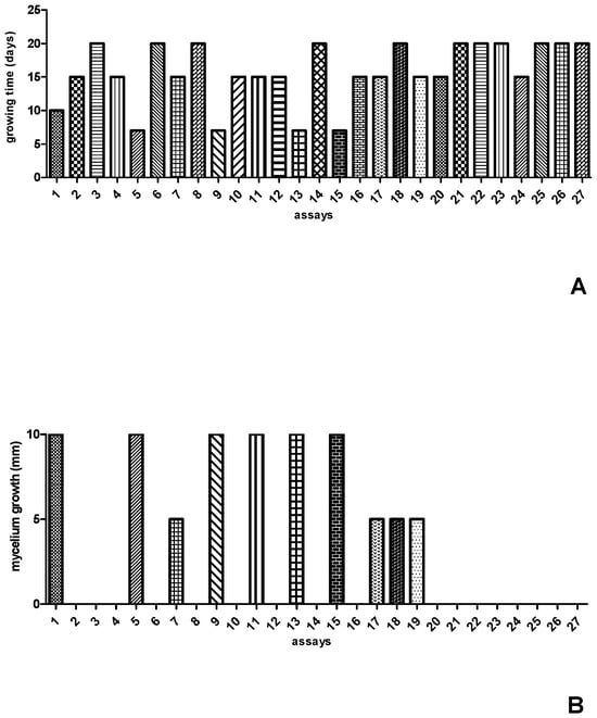Results of the 27 formulations established in the CCR experimental design for growth time (A) and mycelial growth (B) of Streptosporangium sp.