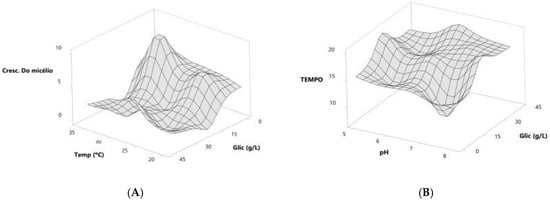 When the dependent variable was mycelium growth, the response surface was generated from the glucose concentration and incubation temperature variables, and what was observed was a positive trend with increasing values for both variables. The response surface graph points to a 10 g/L glucose concentration as the optimal value, while for temperature, the optimal values show an increasing trend, ranging from 24 °C to 32 °C (Figure 3A).