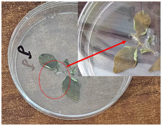 The analysis of P. infestans pathogenicity demonstrated that the fungus caused significant lesions on tomato leaves. The initial symptoms manifested as yellow spots that subsequently turned brown, leading to leaf wilting (Figure 2). Additionally, the affected regions exhibited a white, downy layer, which is a distinctive trait of the P. infestans mycelium.