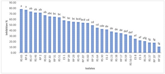 Among the 30 isolates, seven (RS65, RP6, RS47, RS46, RP2, RS61, and P30) exhibited significant inhibition (p < 0.001), with inhibition rates exceeding 65%. Isolate RS65 showed the highest inhibition rate, at 78.48% (Figure 3). This inhibition was manifested by a reduction of mycelial growth of the pathogen treated with bacterial isolates compared to the control (Figure 4).