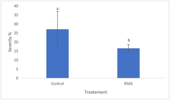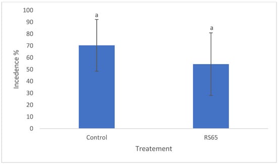 Comparison of disease incidence in tomato plants treated with RS65 versus untreated controls under greenhouse conditions. Bars with the same letters are not significantly different at p < 0.05 using student’s t-test.