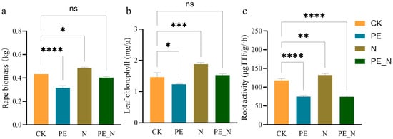All the treatments significantly influenced the rapeseed growth and biomass (Figure 1 and Figure 5). The PE treatment markedly reduced the plant biomass, leaf chlorophyll content, and root activity compared to the CK, while nitrogen fertilization enhanced these parameters. Although the combined PE_N treatment partially mitigated PE’s negative effects, the plant growth indicators remained below those observed under the N-only and CK treatments (Figure 1). These findings suggest that PE contamination impairs plant growth through alterations in key soil physicochemical and biological properties, while nitrogen fertilization helps buffer these adverse impacts.