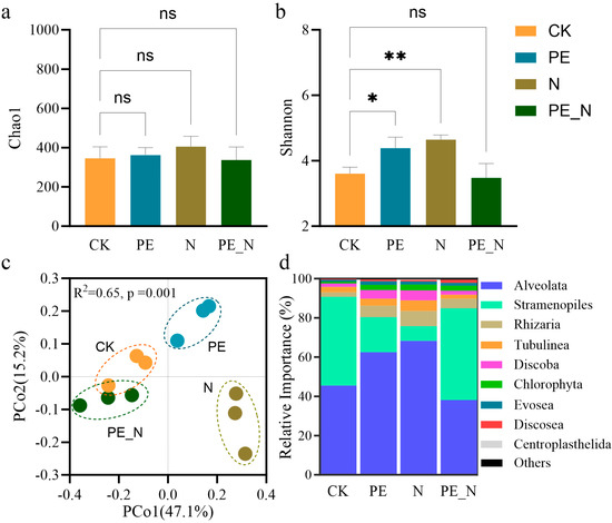 The Chao1 and Shannon diversity indices revealed distinct patterns among the treatments (Figure 2a,b). For the Chao1 index, no significant differences were observed across the treatments (CK, PE, N, and PE_N), although the N and PE treatments showed slightly higher values than the CK. In contrast, the Shannon index demonstrated significant changes in protist diversity. Both the PE and N treatments significantly increased protist diversity compared to the CK (p < 0.05 and p < 0.01, respectively), whereas protist diversity was significantly decreased under the PE_N treatment compared to the N treatment (p < 0.01). A principal coordinate analysis (PCoA) of the protist community composition indicated significant differences among the treatments (Figure 2c; Adonis, p = 0.001), with the first two axes explaining 62.3% of the total variation (PCo1 = 47.1%, PCo2 = 15.2%). The samples were clustered into four distinct groups corresponding to each treatment, highlighting the unique effects of the treatments on the protist community structure. A relative abundance analysis revealed marked differences in the composition of dominant protist divisions across the treatments (Figure 2d). In the CK treatment, Alveolata and Stramenopiles were the dominant groups. The PE treatment increased the relative abundance of Alveolata compared to the CK, whereas the N treatment reduced Alveolata and increased Stramenopiles. The PE_N treatment resulted in a distinct community composition, with significantly altered proportions of the dominant divisions compared to the other treatments. Additionally, some protist divisions, such as Rhizaria and Tubulinea, exhibited varying patterns of relative abundance across the treatments.
