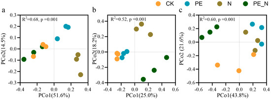 The PCoA analysis revealed significant differences in the community composition of various functional groups under the treatments (Figure 3). For the consumer community (Figure 3a), the PCoA results indicated a clear separation among the treatments (R2 = 0.68, p < 0.001), with the first two axes explaining 66.1% of the total variation (PCo1 = 51.6%, PCo2 = 14.5%). Notably, the PE_N treatment exhibited a community composition relatively similar to the CK, while being distinct from the other treatments, suggesting that PE and N independently influence the consumer community composition. Similarly, in the phototroph community (Figure 3b), PCoA demonstrated a more pronounced separation among the treatments (R2 = 0.52, p < 0.001), with PCo1 and PCo2 accounting for 43.2% of the total variation (PCo1 = 25.0%, PCo2 = 18.2%). The CK and PE treatments clustered distinctly from the N and PE_N treatments, indicating that the N-containing conditions significantly influenced the phototroph community composition. For the parasite community (Figure 3c), the PCoA results also showed significant treatment-related differences (R2 = 0.60, p < 0.001), with PCo1 and PCo2 explaining 64.4% of the total variation (PCo1 = 43.8%, PCo2 = 21.6%). The treatments containing PE, especially PE_N, exhibited distinct clustering patterns compared to the CK treatment, suggesting that the PE_N treatment substantially altered the parasite community structure.