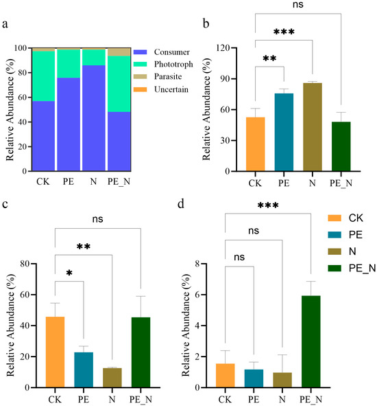 The relative abundance of dominant functional groups also varied significantly across the treatments (Figure 4a). Consumers were the most dominant functional group regardless of the treatment, followed by phototrophs, while parasites and unidentified groups were less abundant. The relative abundance of consumers differed significantly among the treatments (Figure 4b). Both the PE and N treatments significantly increased the consumer abundance compared to the CK (p < 0.01, p < 0.001, respectively). Although the PE_N treatment showed a slightly lower consumer abundance than the N treatment, the difference was not statistically significant. Phototroph abundance displayed distinct patterns under the different treatments (Figure 4c). Both the PE and N treatments significantly reduced the phototroph abundance relative to the CK (p < 0.05 and p < 0.01, respectively), whereas the PE_N treatment showed no significant differences compared to the CK. Parasite abundance was significantly affected by these treatments (Figure 4d). The PE_N treatment significantly increased the parasite abundance compared to all the other treatments (p < 0.001), whereas there were no significant differences in the parasite abundance among the CK, PE, and N treatments.