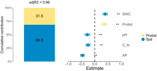 Parameter estimates and variance explained rape biomass. Parameters were classified into two groups: protist community composition (protist) and soil characteristics (soil). SWC stands for soil water content; C/N represents the ratio of total carbon to total nitrogen; AP stands for available phosphorus content. Significance levels defined as follows: ** p < 0.01.