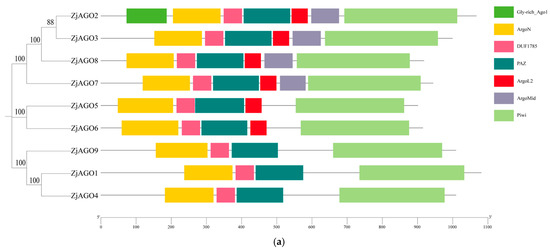 The conserved domains of the jujube AGO proteins were predicted and visualized using Pfam and SMART software. The conserved Argonaute N-terminal, PAZ, and Piwi domains were found in all nine ZjAGOs. The Mid domain was found in ZjAGO2, ZjAGO3, ZjAGO7, and ZjAGO8. A Gly-rich domain was found in ZjAGO2 (Figure 2a).