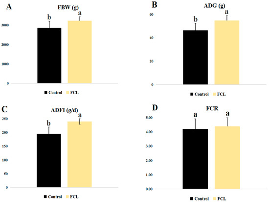 Geese fed with the fermented cassava leaf diet (FCL) showed increases in several growth metrics, including FBW, ADG, and ADFI (p < 0.05, Figure 1), as compared to control geese (CON). FCR, on the other hand, was not affected by the FCL diet (p > 0.05). No geese in either group died during the experiment, so the effect of the FCL diet on goose mortality could not be assessed.