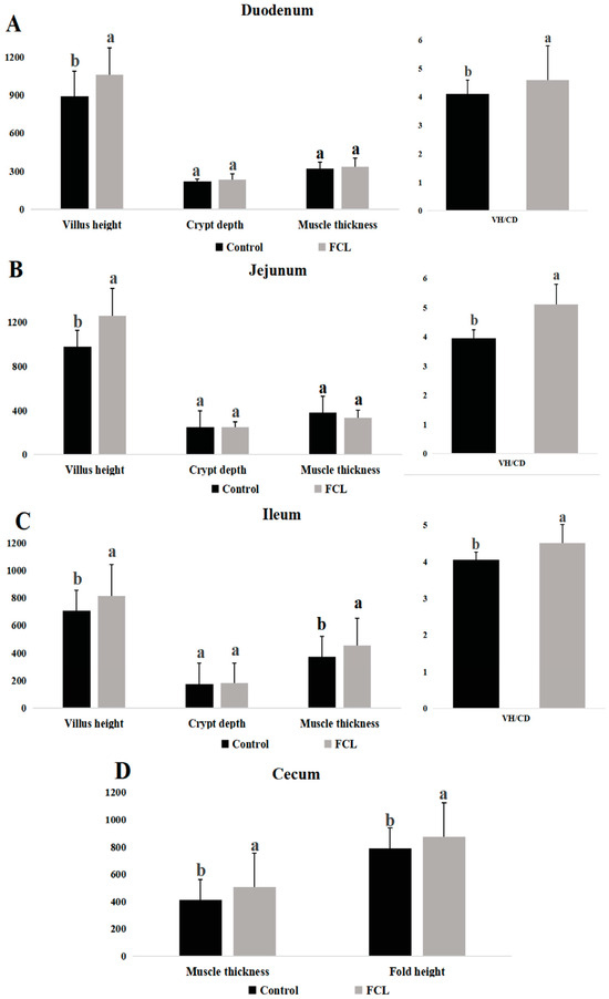 The intestinal morphologies of geese in the FCL and CON groups differed in several ways (Figure 2). Geese in the FCL group had higher VH and VH/CD in their duodenums, jejunums, and ilea than CON group geese (p < 0.05). There were no significant differences in CD and muscle thickness in these tissues, however, between the FCL and CON geese (p > 0.05). Geese in the FCL group had elevated cecal muscle thickness and fold height relative to CON group geese (p < 0.05).